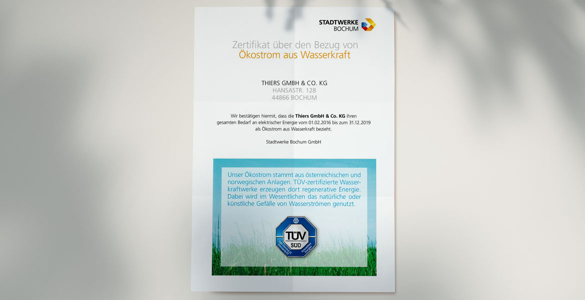 Wir haben von den Stadtwerken Bochum ein Zertifikat über den Bezug von Ökostrom aus Wasserkraft erhalten.